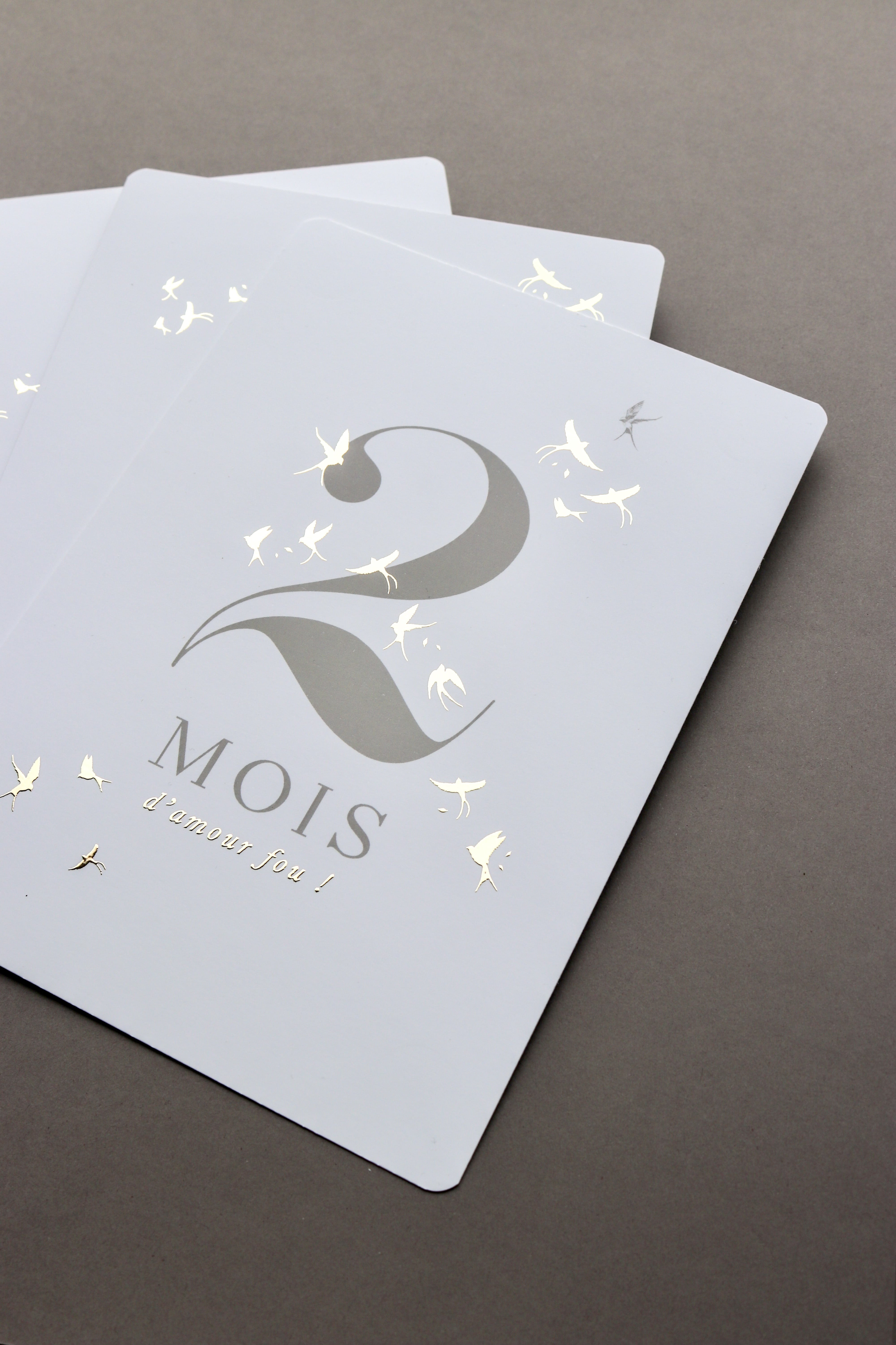 Immortalise your baby's first year with the "Baby's First Year" box set. Composed of 12 large format step cards, with a finish combining gilding + "Soft Touch" matt lamination, this box will allow you to take superb photos as a souvenir and to note on the back its evolution month after month.