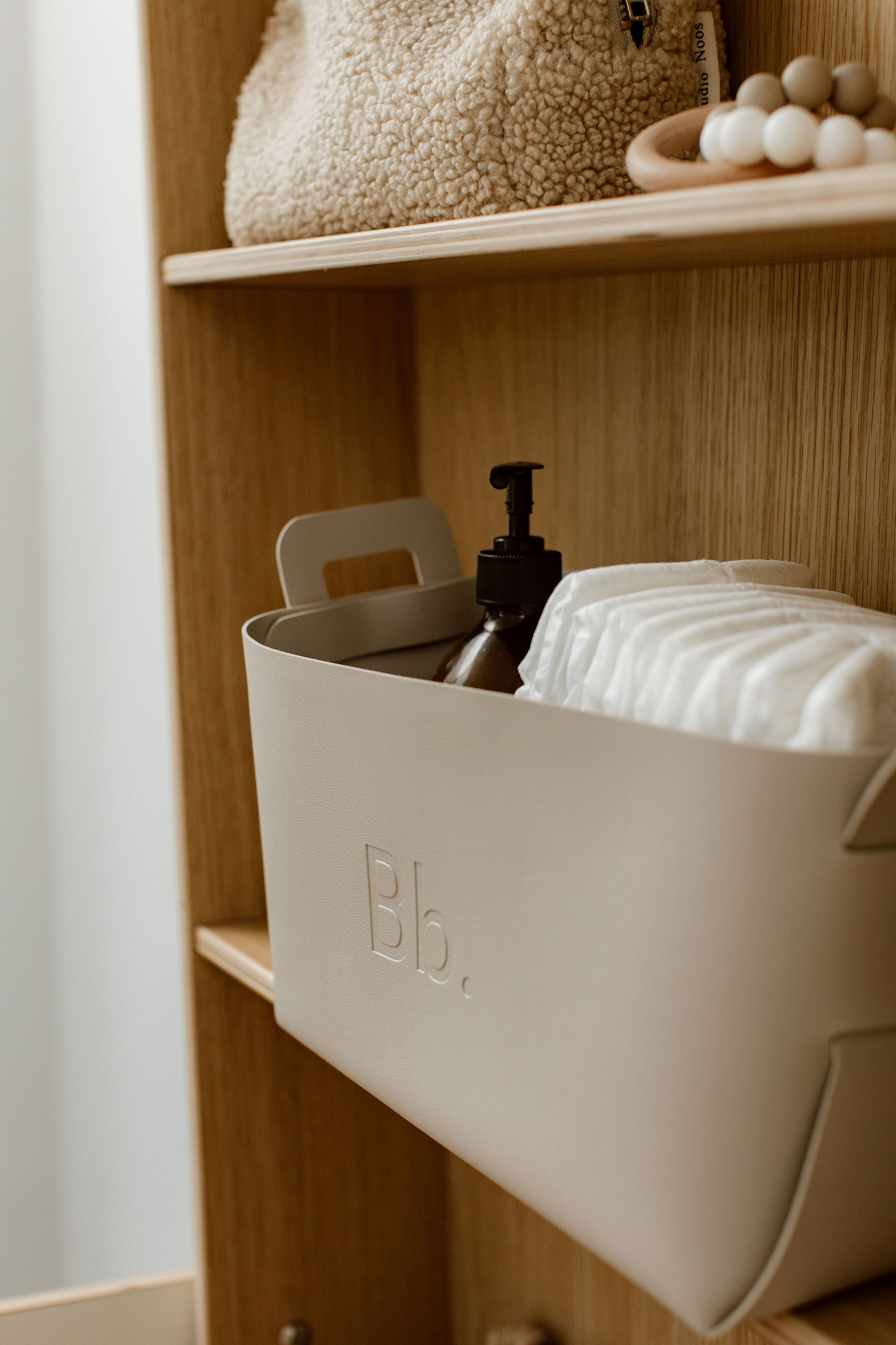 Un joli panier à langer aux lignes épurées qui permet de ranger le nécessaire de toilette de bébé...