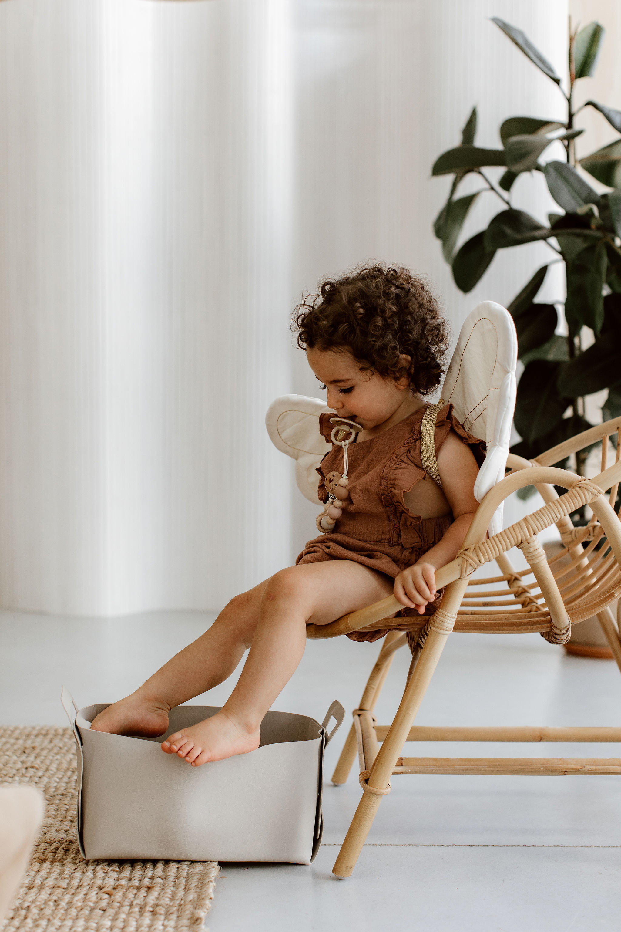 Un panier en simili cuir aux lignes épurées pour ranger les affaires de bébé...